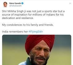 / मिल्खा सिंह का फोटो : Qo95t5seevbb0m / 'फ्लाइंग सिख' के नाम से मशहूर मिल्खा सिंह अब इस दुनिया में नहीं रहे, बता दें उनके निधन पर बॉलिवुड के कई बड़े सिलेब्स ने दुख जताया है। शाहरुख खान, प्रियंका चोपड़ा, रवीना टंडन, अक्षय कुमार सहित कई बॉलिवुड सिलेब्स इससे पहले रविवार को उनकी पत्नी निर्मल कौर, जो पूर्व नेशनल वॉलीबॉल कप्तान थीं, उनका भी कोरोनावायरस के कारण ही निधन हो गया था।